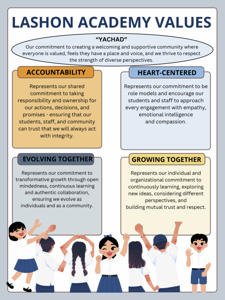 The meaning of Lashon holds great importance in the development of language and the power of its use. Lashon Academy Charter School will instill in their students the understanding that speech, or words are very powerful and have a decisive impact on our lives. Lashon Academy places a high value on academic excellence, communication in multiple languages, and community service. We emphasize respect for all people and guide our students towards mutual understanding and respect for others. Through service learning, all students are instilled with a sense of their social responsibility and efficacy.